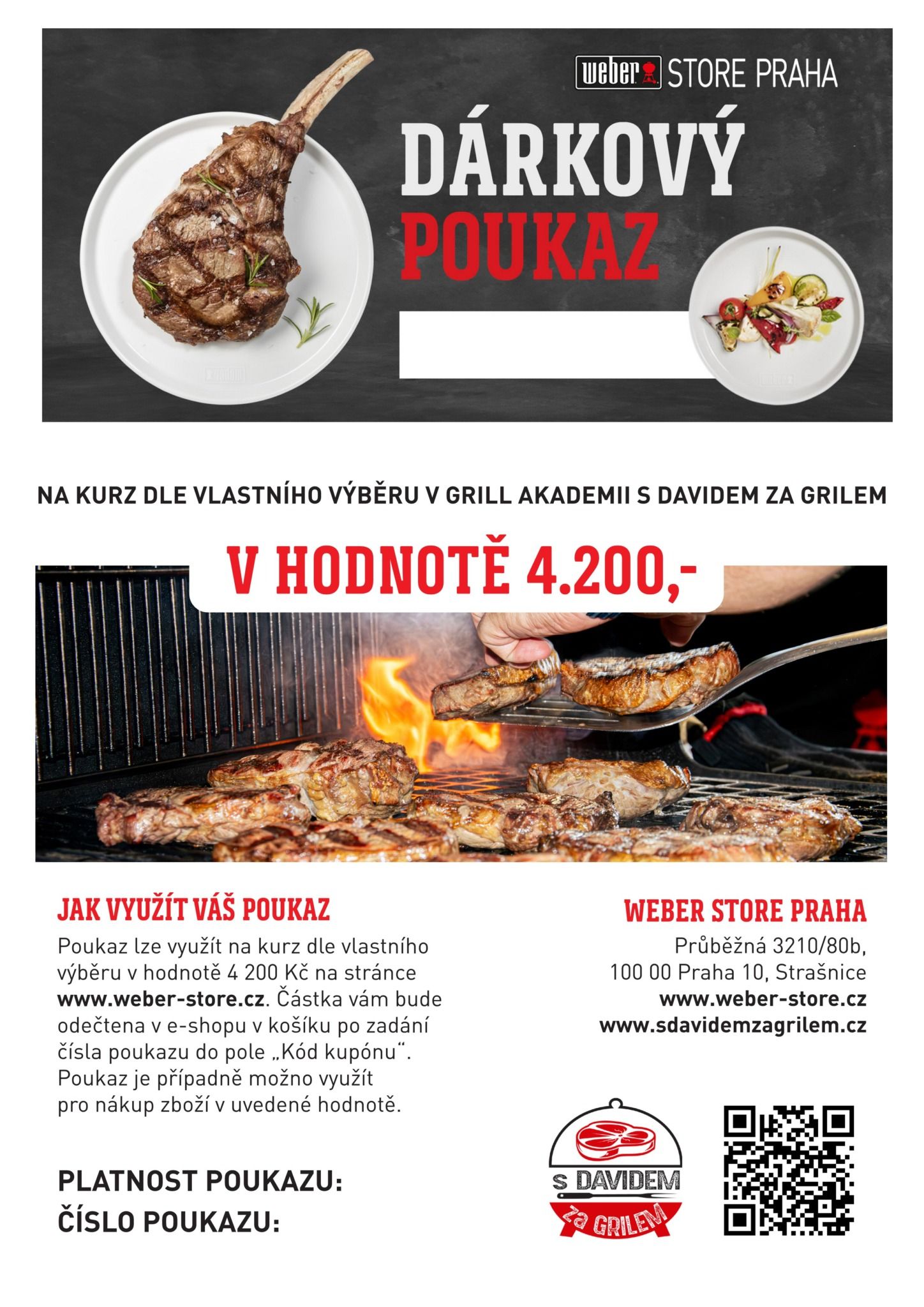 Poukaz lze využít na kurz dle vlastního výběru v hodnotě 4 200 Kč na stránce www.weber-store.cz. Částka vám bude odečtena v e-shopu v košíku po zadání čísla poukazu do pole „Kód kupónu“.