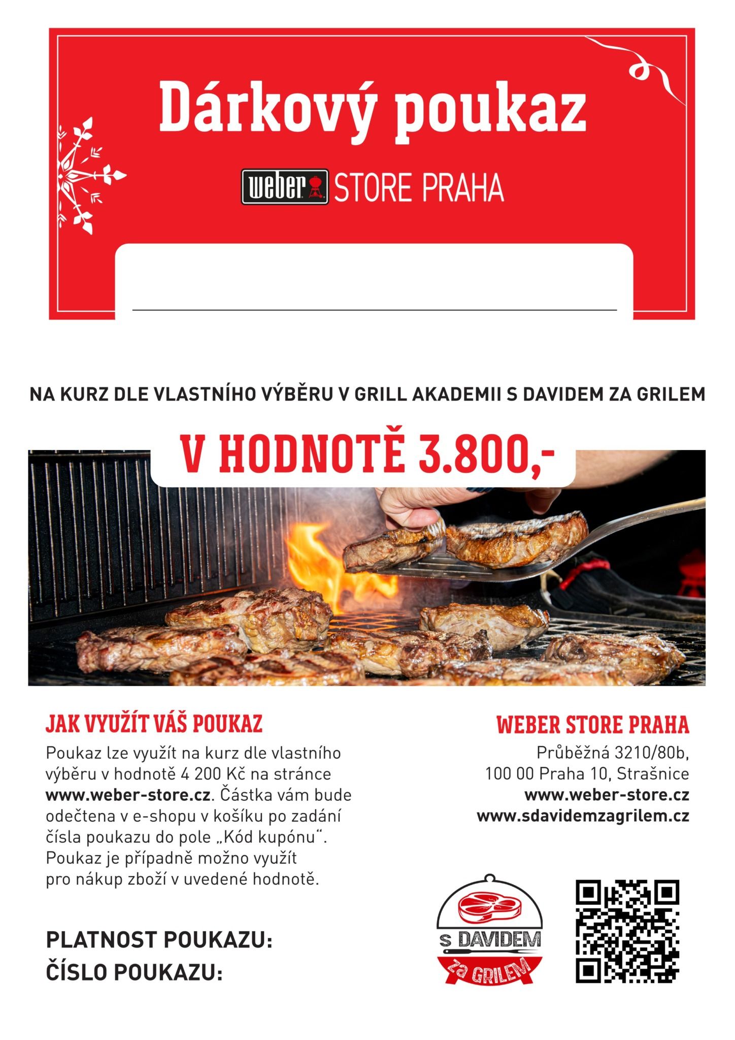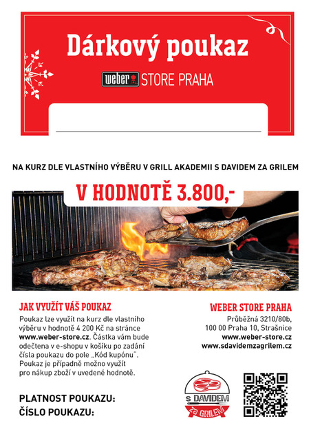 Poukaz lze využít na kurz dle vlastního výběru v hodnotě 3 800 Kč na stránce www.weber-store.cz. Částka vám bude odečtena v e-shopu v košíku po zadání čísla poukazu do pole „Kód kupónu“.