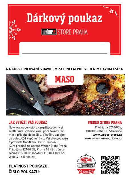 Z kurzu si krom vědomostí odnesete grilovací zástěru WEBER®, praktickou příručku se všemi recepty, které jste se na kurzu naučili a certifikát o absolvování kurzu. Kurz začíná v 17:00 (v sobotu v 11:00) a trvá obvykle 4 až 4 a půl hodiny na adrese Weber Store Praha, Průběžná 3210/80B, 100 00 Praha 10 Strašnice.