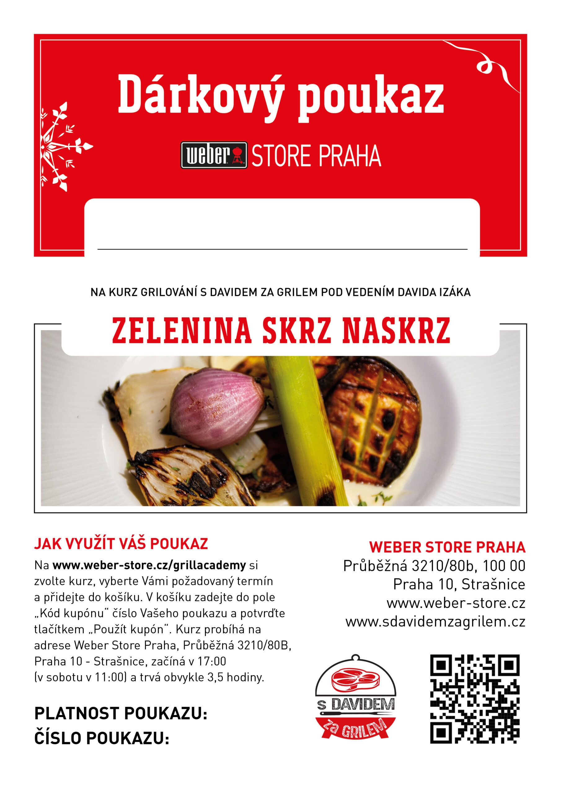 Z kurzu si krom vědomostí odnesete grilovací zástěru WEBER®, praktickou příručku se všemi recepty, které jste se na kurzu naučili a certifikát o absolvování kurzu. Kurz začíná v 17:00 a trvá obvykle 4 až 4 a půl hodiny na adrese Weber Store Praha, Průběžná 3210/80B, 100 00 Praha 10 Strašnice.