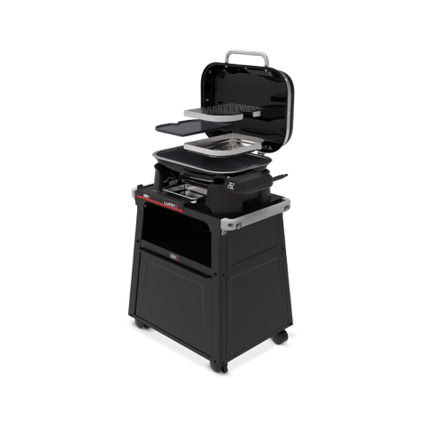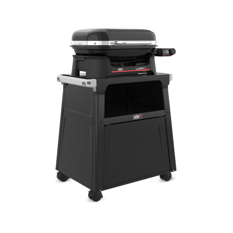 Prémiový stojan se snadno přemisťuje po prostoru díky čtyřem zajišťovacím kolečkům a přidává další prostor díky uzavřenému úložnému prostoru uprostřed a bočním lištám, na které se vejde příslušenství Weber Works (prodává se samostatně).