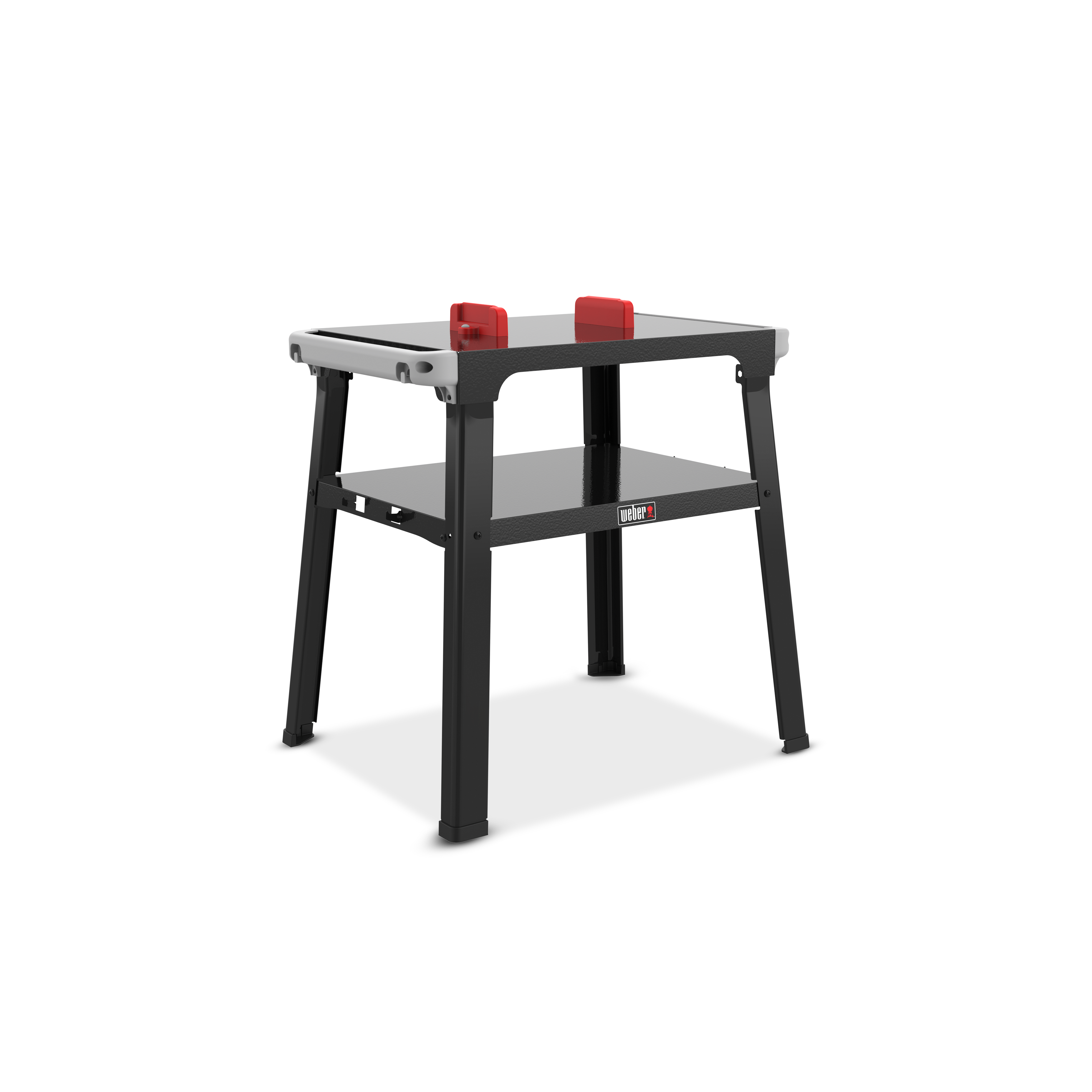 Stojan také obsahuje úložnou poličku pro uložení nezbytností pro grilování a další dva vestavěné háčky pro zavěšení grilovacích roštů, když se nepoužívají.