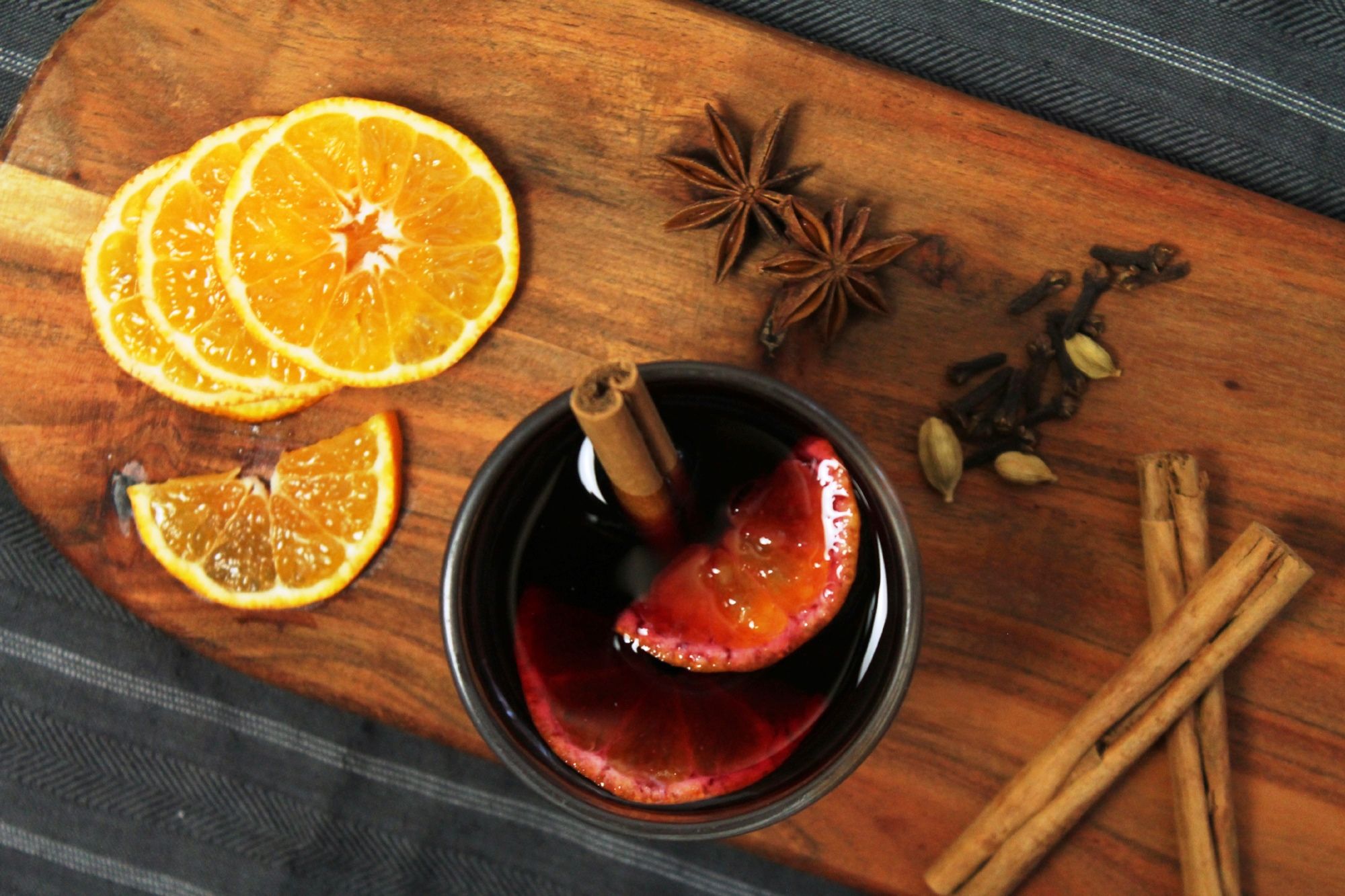 - Do litinového hrnce vlijte víno a vložte půlky pomeranče s hřebíčky, mletou skořici, skořicové tyčinky, badyán, třtinový cukr a Cointreau nebo jiný pomerančový likér.