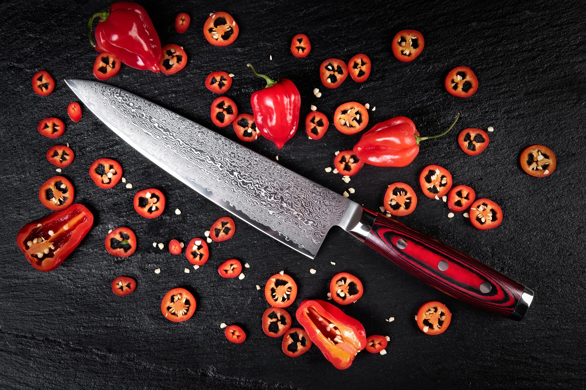 Proces výroby damaškové oceli vychází z tradiční japonské techniky pro výrobu samurajských mečů. Výroba spočívá ve spojení tvrdé vysokouhlíkaté oceli a houževnaté nízkouhlíkaté, které se opakovaně překládají. Následuje opakované zahřívání a šokové zmražení čepele. Výsledkem je mimořádně tvrdá a současně houževnatá ocel, která má dokonalé ostří a nikdy nekoroduje. Čepel nože je tvořena celkem 161 vrstvami damaškové oceli – jádro z ultra tvrdé mikrokarbidové práškové nerez oceli SG2, obklopené 80 vrstvami houževnaté damaškové oceli z každé strany.
