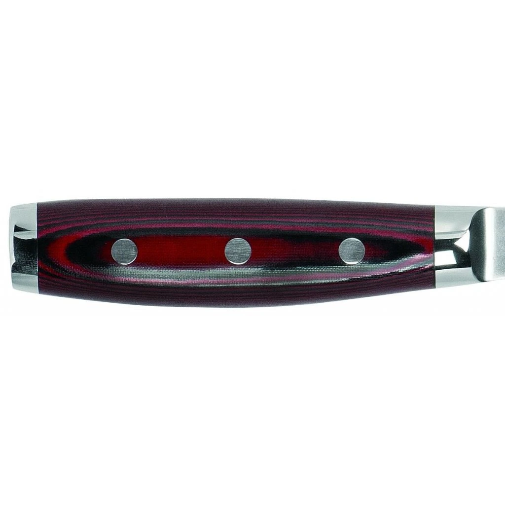 Rukojeť nožů Super GOU 161 je vyrobena z červeno-černé plátnové mikarty – mimořádně odolného materiálu, který je známý svou dlouhou životností, odolností vůči vlhkosti a pachům a minimálními nároky na údržbu. Mikarta je pevně připevněna třemi nerezovými nýty, které zajišťují stabilitu a dlouhou životnost nože