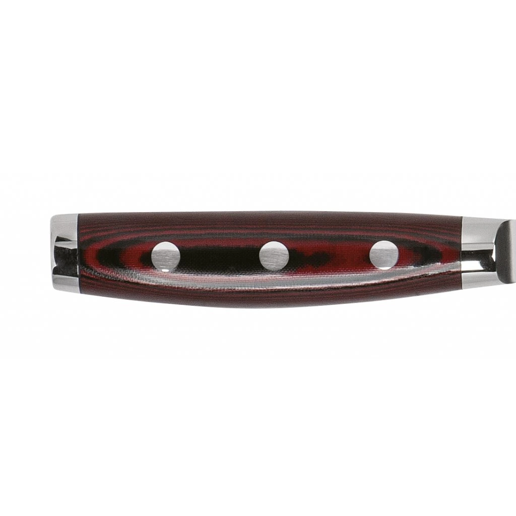 Rukojeť nožů Super GOU 161 je vyrobena z červeno-černé plátnové mikarty – mimořádně odolného materiálu, který je známý svou dlouhou životností, odolností vůči vlhkosti a pachům a minimálními nároky na údržbu. Mikarta je pevně připevněna třemi nerezovými nýty, které zajišťují stabilitu a dlouhou životnost nože