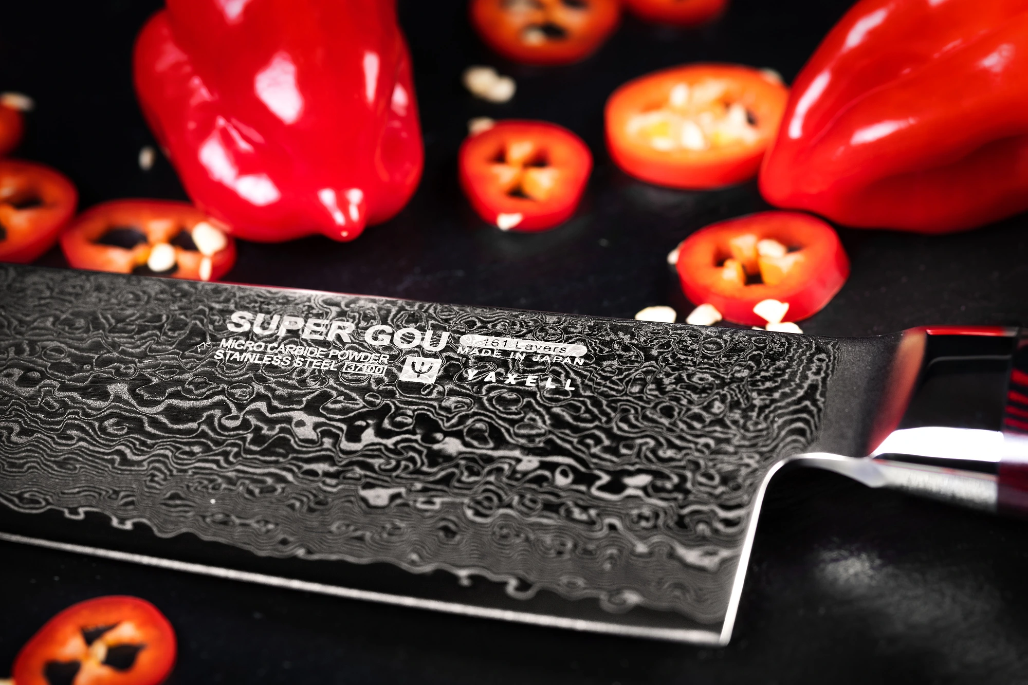 Japonské nože Yaxell jsou z damaškové oceli. Proto když se na závěr čepel opískuje, díky odlišné tvrdosti dojde k odhalení krásné kresby střídajících se vrstev oceli. Řada Super Gou má neuvěřitelných 161 vrstev damaškové oceli, díky čemuž každý nůž získává svůj jedinečný vzor. Neexistují dva nože, které by byly stejné, proto je každý nůž jedinečný a jedině váš!