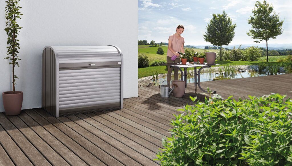 Jako například minigaráže na kola a na motorku, boxy na popelnice boxy na popelnice, vyvýšené záhony na bylinky a okrasné květiny, robustní dřevníky, různé držáky na kola a venkovní zástěny na ochranu soukromí. To vše je samozřejmě vyráběno ve stejné kvalitě jako zahradní domky, pro které je značka Biohort známá po celém světě.